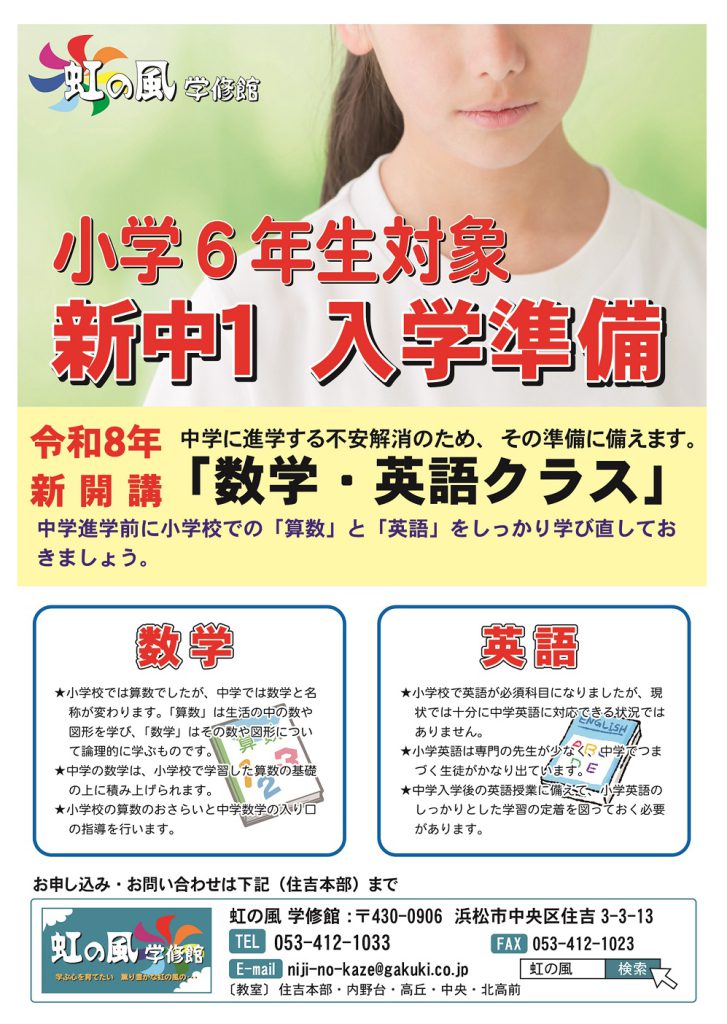 虹の風 学修館では、その不安解消のため、数学・英語の新クラス開設で中学準備に備えます。